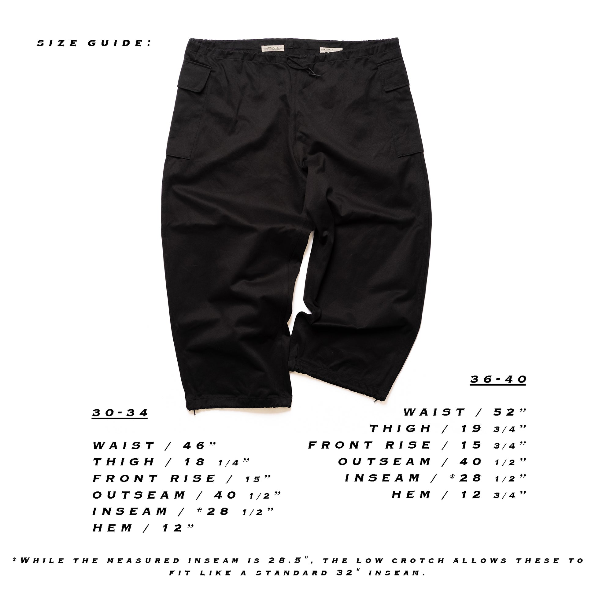 See final image for the size guide.While the measured inseam is 28.5", the low crotch allows these to fit like a standard 32" inseam.